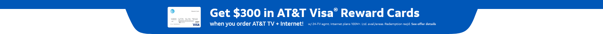 Reward Cards: For each offer, will be e-mailed or mailed a notice with redemption requirements. Redemption req’d w/in 75 days from notification e-mail or mail date. Will get Card(s) within 3-4 weeks after redemption. Card(s) expire at month-end 6 months after issuance. For cardholder agreement, go to http://rewardcenter.att.com. The AT&T Visa Reward Card is issued by The Bancorp Bank pursuant to a license from Visa U.S.A. Inc. and can be used everywhere Visa debit cards are accepted in the United States, US Virgin Islands, and Puerto Rico. No cash access. The Bancorp Bank; Member FDIC.